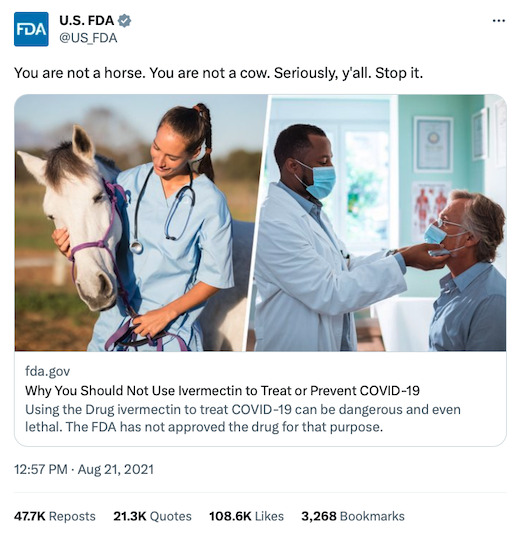 I know history isn’t our strong point but if you consult the wayback machine you might recall that the the FDA and every liberal outlet told Americans that Ivermectin was horse medicine. After all, the general assumption that Ivermectin is a horse dewormer didn’t come from nowhere. It was a narrative cultivated in us by the FDA and the corporate media. Here is the tweet the agency sent out exactly two years ago to persuade us that only dangerous nut-jobs (ie. Trump supporters) talk about Ivermectin: